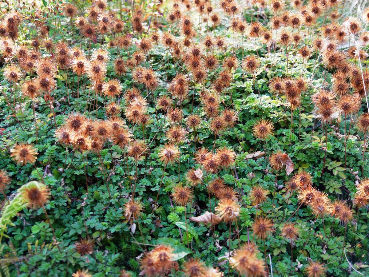 A genus of 100 species of low growing perennials from New Zealand and cooler parts of South America but also some occur in Australia and else where in the pacific region. Thin creeping stems bear clusters of hairs and at intervals, small pinnate leaves with toothed edges. Insignificant flowers are green or purple-brown in dense spikes followed by dry fruit with hooks that cling easily to clothes.