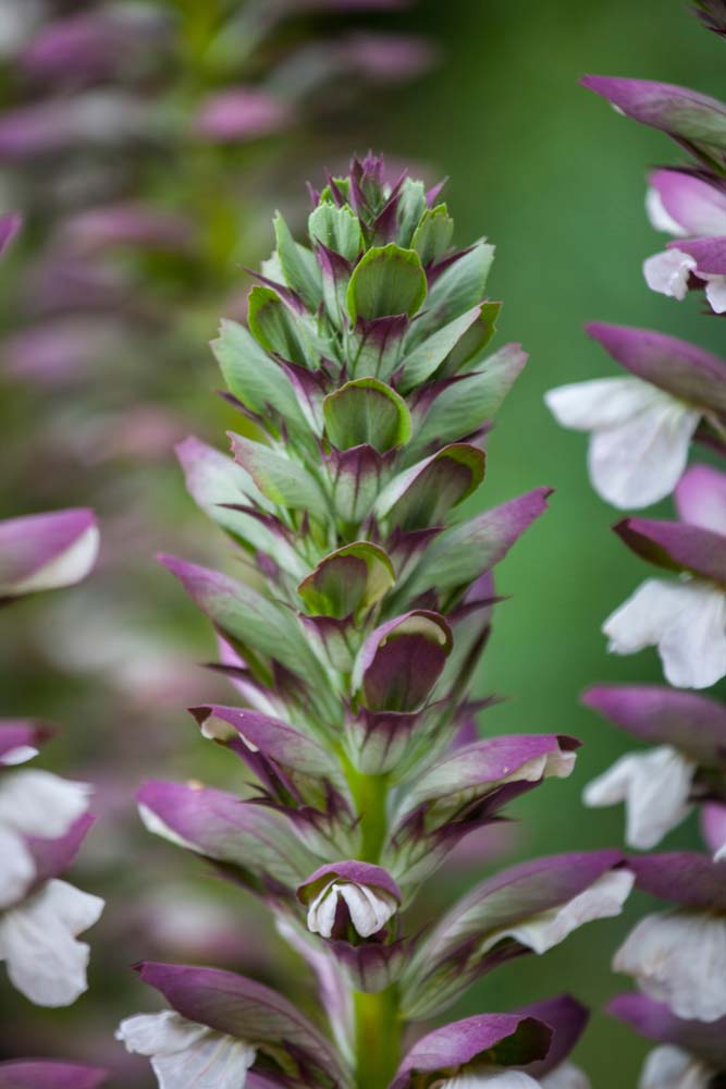 Acanthus spinosus – Found from Italy to Western Turkey this clump forming perennial grows 5 feet tall and 24-36” inches wide. Produces 3-foot narrow oblong-rounded to egg shape arching dark green leaves cut deeply to midrib with spiny edges. A 3-foot cluster of pure white flowers with purple bracts appear form late spring to midsummer.