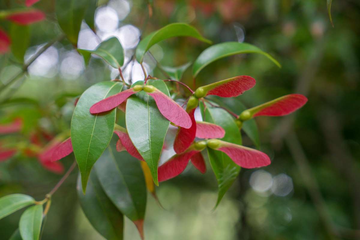 Acer fa11bri – Grows to 30’ feet tall and is usually an evergreen but can be deciduous in colder areas. The shiny dark unlobed leaves are 6 inches long and ½” inch wide with mostly smoothed edges. Small immature fruits are bright red. Prefers humid conditions.