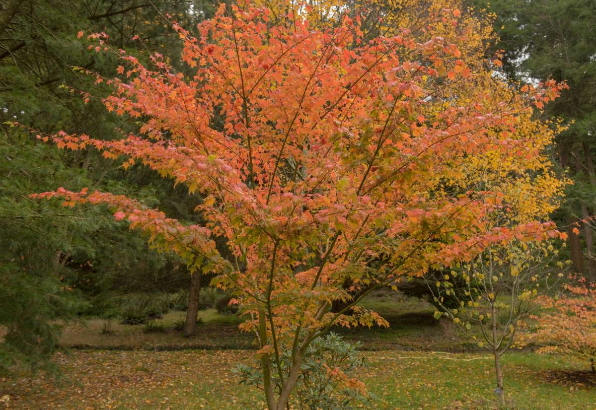 Acer micranthum – Native to Japan this small tree or large shrub is deciduous with arching branches. On red young shoots it bares small 5 lobed deeply divided mid green leaves with serrated edges, which are 2-3” inches long. Produces pendent flowers arranged on a common stem of greenish white. Grows 30’ feet tall and 25’ feet wide. Turning yellow and red in autumn