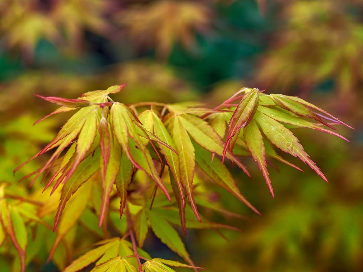 Acer palmatum – Japanese Maple – Maple – Rounded headed, deciduous tree from China, Korea and Japan and grows 25’ feet tall and 30’ feet wide. It produces rounded. Shallowly to deeply 5 to 9 lobed, mid green leaves, 2-5” long, which turn orange to yellow or red in autumn. It bears tiny, purple-red flower, produced in small, pendent corymbs, are followed by red winged fruit in late summer