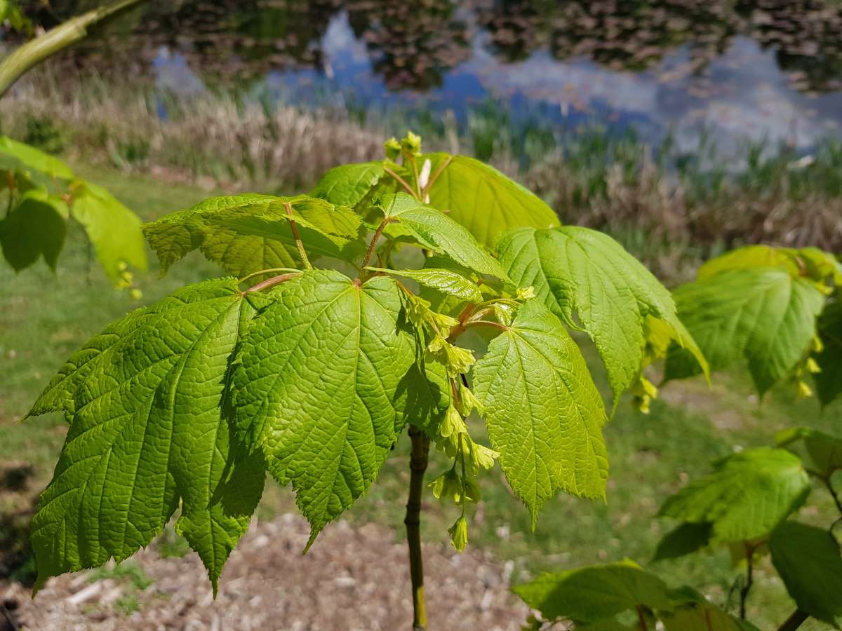The 6” inch 2-4 lateral forward pointing triangular lobed leaves turn golden amber in autumn.