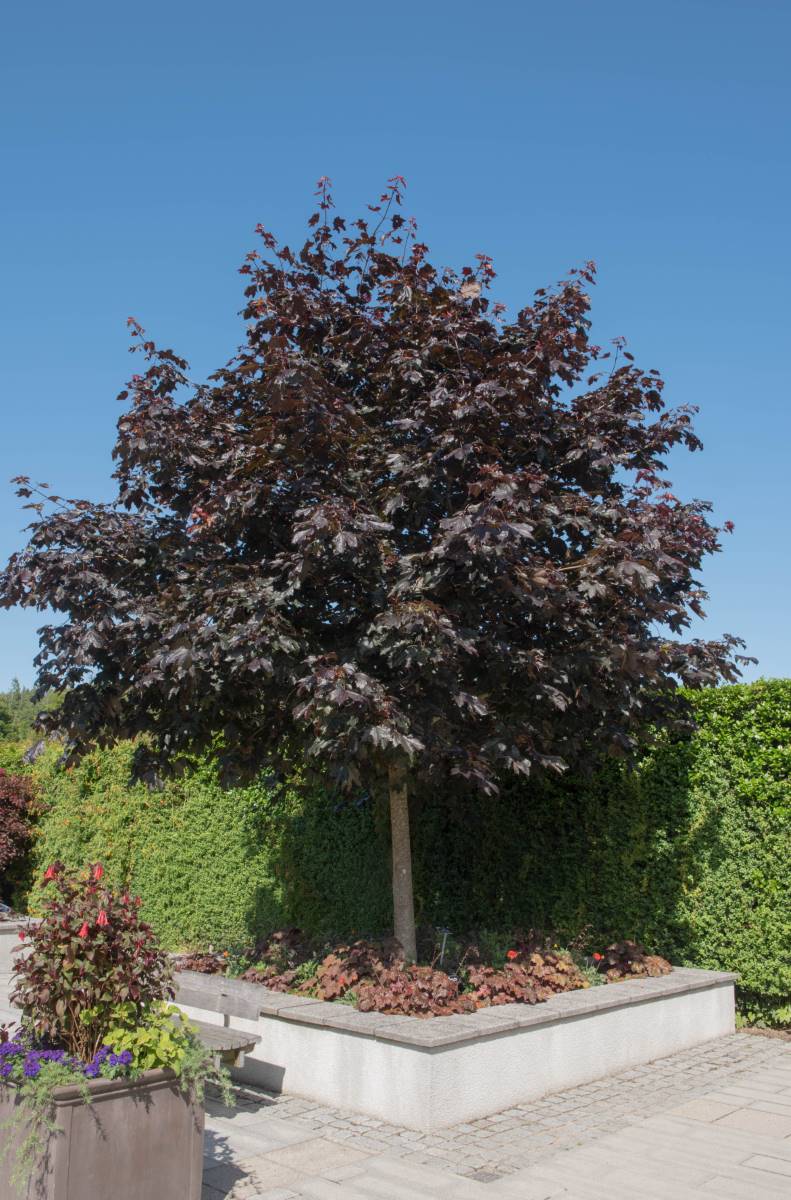 ‘Crimson King’ – Crimson King Maple – This large round headed tree thrives in a wide range soils and situations. Grows 30-50’ feet tall in a narrow column, best known for its deep red spring foliage turning reddish green in summer and finally orange and crimson in autumn. Flower stalks are prominently red.