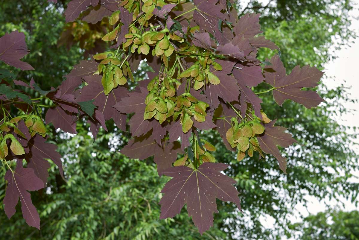 ‘Atropurpureum’ – ‘Purple Sycamore Maple’ – Grows 80’ feet tall and 70’ feet wide with dark green leaves above with reddish purple undersides. The new shoots are reddish. It bears clusters of red winged fruit in late summer.