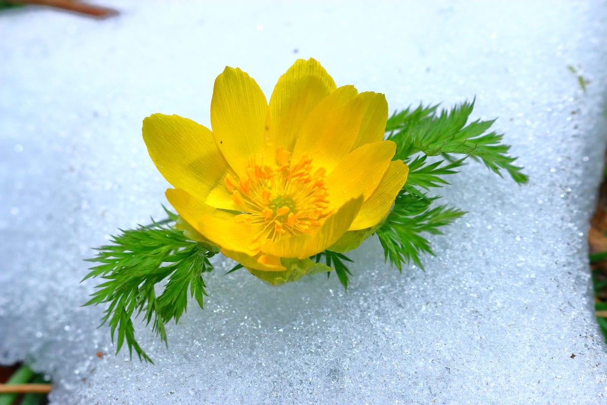 There are about 20 species of annuals and perennials in this genus from Europe and the cooler parts of Asia in alpine habitats. Named after the Greek god Adonis beloved of Aphrodive who when was killed by a boar and the drops of blood made this annual species red. Fern like leaves mostly finely divided especially at the uppermost parts. The leaves on the stems form a sort of nest the single bowl shape flower rests. The leaves may die back in summer in some species. Perennials are usually have a yellow flower and the annuals are red. More frequently the perennials are grown.