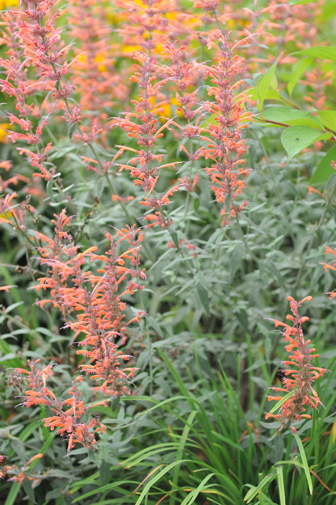 Agastache ‘Firebird’ – This erect aromatic perennial can grow 2-6’ feet tall and just 1-3’ feet wide. The egg shaped to oval toothed 1 ½-2” long leaves. In mid summer to late autumn it produces 12” loose spikes of cooper-orange flowers.
