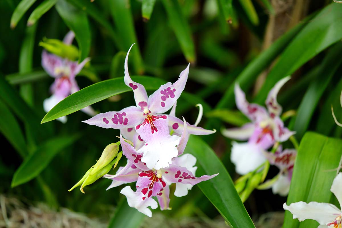 These evergreen orchids are cross between Brassia, Miltonia and Oncidium. There basal rhizomes sprout 2 narrowly oval mid green leaves with pointed tips. It produces up to 12 star shaped long lasting racemes that varies in size and color at various times throughout the year.