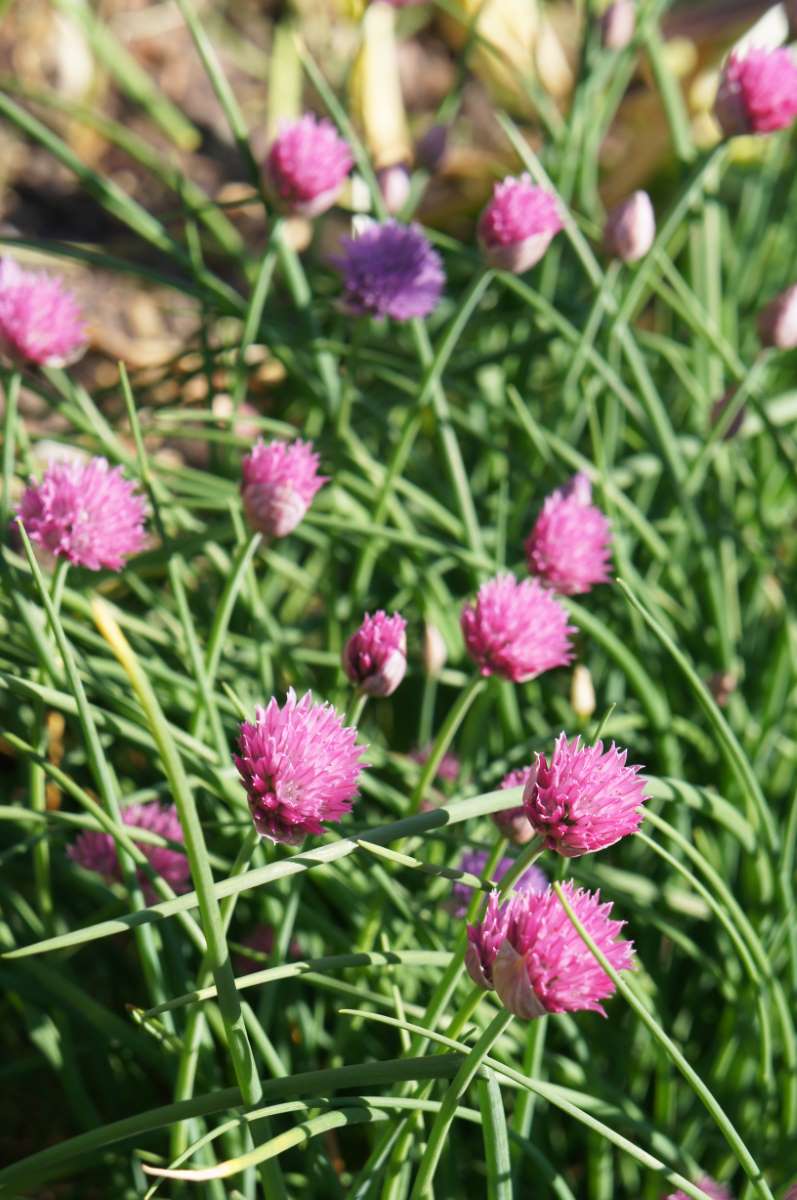 Allium schoenoprasum ‘Forescate’ – Chives – This vigorous bulbous perennial grows 24” tall in neat small neat clumps. It bears dark green 14” long leaves used for flavoring and garnishing. It produces dense ball like umbels, 1” across of rose pink flowers in late spring and summer, which are edible. Plant in full or part shade keep well watered and divide every 2 or 3 years.