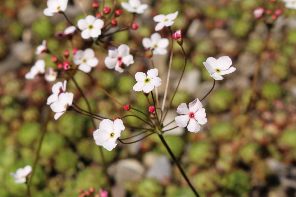 There are about 100 species of annuals, biennials, mostly evergreen mat or cushion forming perennials, in this genus. They occur in the mountains of the Northern Hemisphere. The small rosettes produce hairy leaves and produce stemless or short stemmed tubular based small white or pink, 5 petalled flowers in spring in summer with flat or cup shape lobes held singly or in umbels. Favorite for rock gardens.