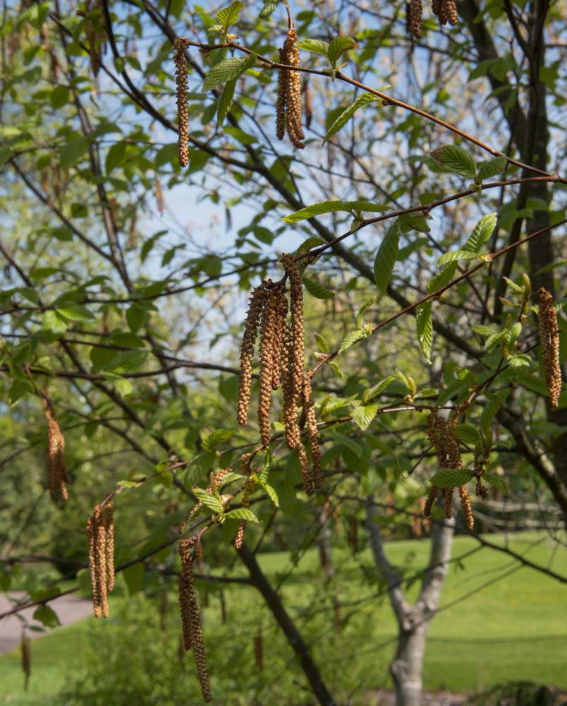 B. Lenta – Cherry Birch – Sweet Birch – Black Birch – This conical tree from Eastern North America grows 50-80′ feet tall and 40′ feet wide.It has smooth, dark reddish brown bark that becomes gray, almost black and scaly in maturity.Aromatic shoots carry ovate to egg shaped, matte, yellow-green leaves, to 4″ long, which turn yellow in autumn.In early spring it bears pendulous, yellow-brown male catkins, to 3″ long.