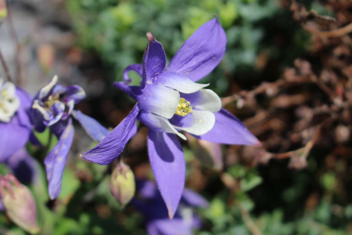 Aquilegia alpina – Aquilegia montana – Alpine columbine – This upright perennial from the Alps of Europe grows 18” or more tall and spreads to 6-12” wide. It produces finely divided ternate or 2 ternate bluish green leaves divided into leaflets 1 ¼” long. In late spring it bears terminal leafy racemes of 2 or 3 nodding blue flowers sometimes with white petal tips with straight or curling spurs to 1” long. Prefers rich soil in sun or partial shade.
