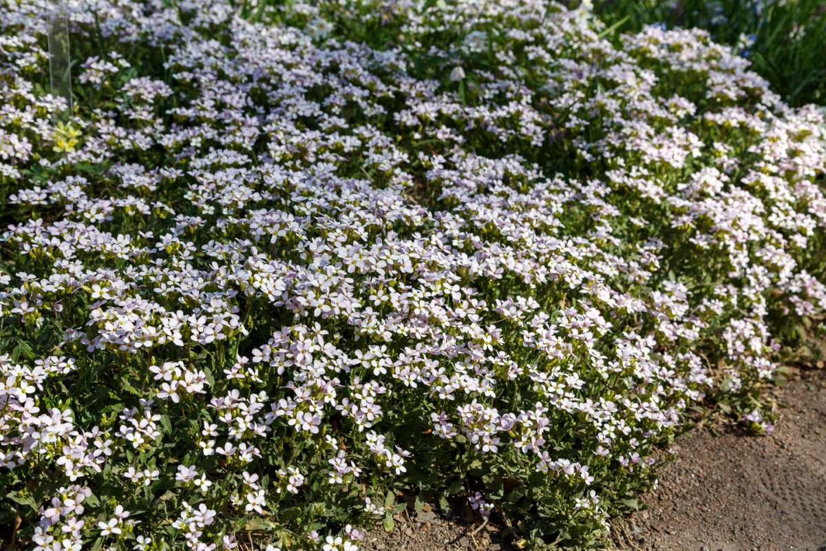 Arabis caucasica – Arabis albida – Arabis alpina subsp. Caucasica – Arabis billardieri – Wall Rock Cress – This easily grown, tough vigorous mat forming evergreen perennial from Southern Europe grows to 6” tall and spread to 20” or more wide. It produces loose rosettes of egg shaped, toothed gray-green leaves 1 ¼-2” long. In late spring it bears loose racemes of scented white flowers to ½” across.