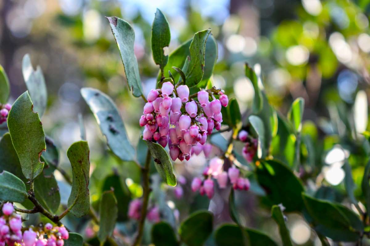 There are around 50 species of prostrate or upright shrubs or small trees that are all evergreen except for one species, in this genus. They occur mainly from Western North America, mainly in California, or Mexico. Native to a range of habitats like moist or dry areas from coastal scrub to mountain slopes, pine forest, and high boggy land. Mostly have very ornamental bark, purple, red, or orange that’s peels in thin shreds or flakes. From woody stems they carry alternate, simple un-toothed or un-lobed or toothed leathery leaves. They bear small terminal panicles or racemes of tiny, white or pink, bell or urn shaped flowers 1/8-1/4” long followed by spherical fruits ¼-1/2” wide.