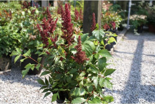 Astilbe chinensis – This vigorous clump forming perennial derives from China, Korea, and Eastern Siberia and grows to 24” tall and in breadth. It produces 3 ternate, toothed softly haired, dark green leaves. In late summer it bears dense panicles of tiny star shaped pinkish white flowers.