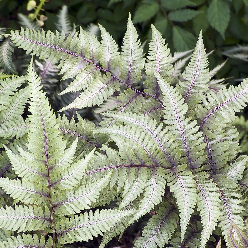 Athyrium niponicum – Athyrium goeringianum – Japanese Painted Fern – This deciduous fern from Japan grows 8-12” tall and has an indefinite spread. It produces creeping red brown rhizomes and 2 or 3 pinnate to pinnatifid lance shaped silvery gray-green fronds to 14” long with red-purple midribs. Individual segments of the fronds are lance shaped to oblong or ovate sometimes with notched or lobed edges. Great as a ground covers.