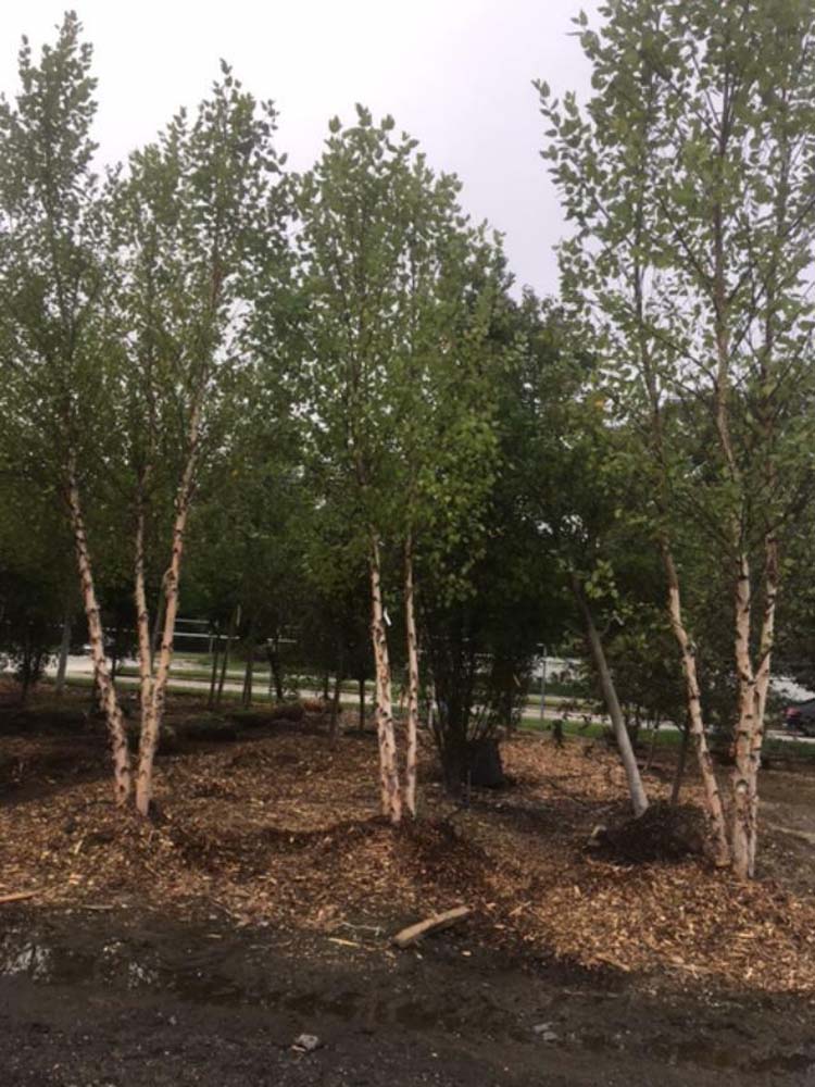 B. nigra ‘Heritage’ – River Birch – Tropical Birch – Black Birch– This vigorous, deciduous, conical to spreading tree found by riverbanks in Eastern USA grows 30-60′ feet tall and 40′ feet wide. It has exfoliating bark in large curling plates, peeling in layers when young, becoming that is white to salmon white young then darkens to orange-brown becoming fissured on old trees. It produces diamond to triangular shaped, glossy, irregularly toothed edged, mid to dark green leaves, to 3″ long, glaucous beneath, turn yellow in autumn. In early spring it bears yellow-brown male catkins, to 3″ long. Tolerates hot and dryness and resistant to birch borer.