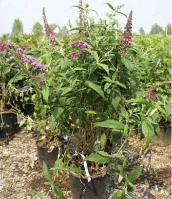 B. davidii – Butterfly Bush – Summer Lilac – This variable, fast growing, deciduous semi evergreen shrub from rocky river sides and chalky and limestone wasteland in Central and Western China and Japan, grows 112-18′ feet tall and 15′ feet wide. From long, arching shoots it carries lance shaped, pointed, mid green to gray green leaves, to 10″ long with woolly white undersides. From late summer to early autumn it bears dense, conical, arching panicles, 12″ or more long, of fragrant, lilac to purple flowers, often with orange or yellow eyes. This species and variants are the most commonly seen in gardens.