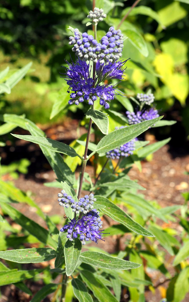 C. x clandonensis ‘Blue Mist’ – Mist Shrub – Blue Spiraea – These crosses between C. incana and C. mongolica grows 3′ feet tall and 5′ feet wide. They form neat and compact, dense, mounds composed of ovate-lance shaped, slightly irregularly toothed, gray-green leaves, to 2″ long, silver hairy beneath. They bear delicate axillary and terminal cymes of powder-blue flowers, to ½” across, in late summer and early autumn.