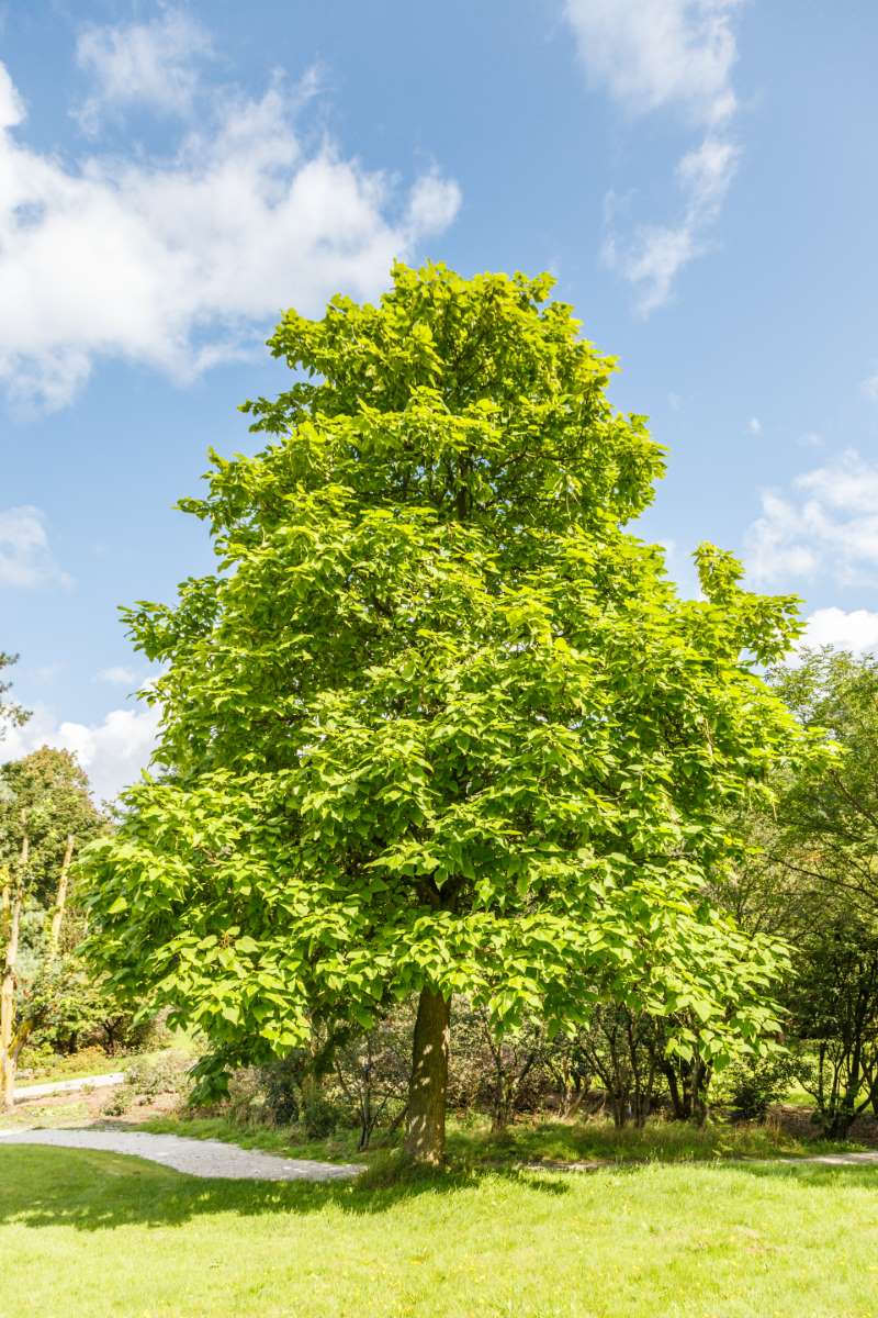 There are about 11 species of fast growing, deciduous small to medium trees, in this genus. They occur in Eastern Asia, North America, and Cuba on riverbanks and in woodland. Their large ovate leaves are opposite or in whorls of 3. Catalpa are grown for their showy foliage, for their large, bell shaped, 2 lipped flowers, held in upright, terminal panicles or racemes in mid and late summer, and for their pendent, bean like, up to 30″ long, narrowly cylindrical seed pods, which develop in autumn. Their wide spreading habit and conspicuous flower panicles are seen to best advantage when they are grown as specimen trees. Those with colored foliage are also effective in a large shrub border, if pollarded or coppiced annually or biennially, they produce large ornamental leaves. Some species yield valuable timber.