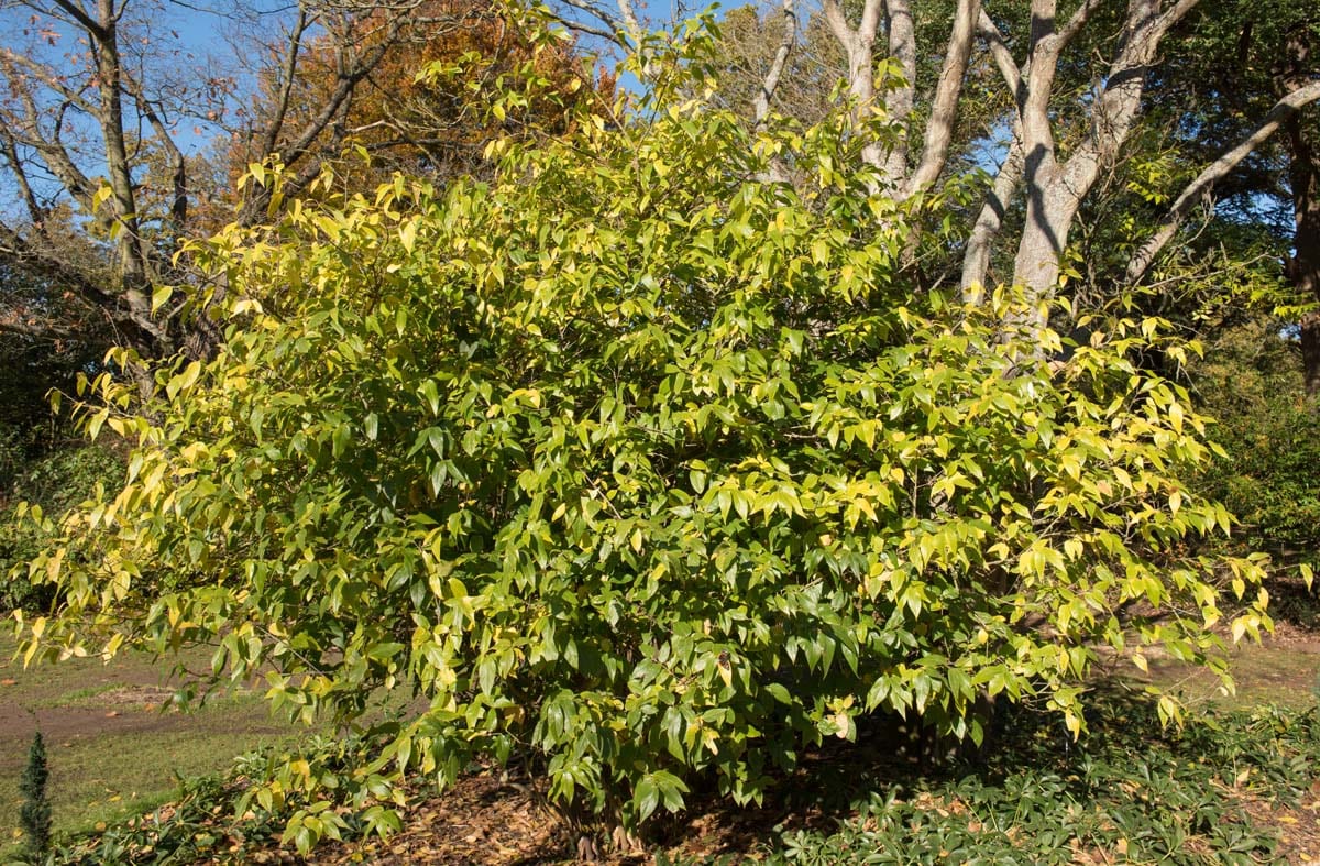 C. praecox ‘Luteus’ – C. praecox ‘Concolor’ – C. fragrans ‘Luteus’ – C. fragrans ‘Concolor’ – Japanese Allspice – This vigorous, broadly upright, deciduous shrub grows 10-15′ feet tall and wide. It produces smooth edged, lance shaped, glossy, mid green leaves, to 8″ long, rough above, smooth beneath, arranged in opposite pairs, and turn yellow in autumn. In winter it bears an abundance of pendent, fragrant, clear yellow flowers, 1″ across, stained brown or purple inside, that open widely, on bare branches on previous years growth. Fruits are yellowish brown when ripe.
