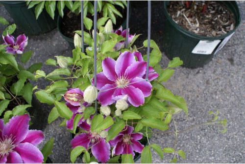 Grow in fertile, humus rich, well drained soil in sun or partial shade, with the roots and base of the plant in shade. Herbaceous species prefer full sun. Mulch all clematis in late winter with compost or well rotted manure, avoiding the crown. Plant climbing clematis with the top of the root ball about 3″ below the soil surface, to reduce risk of clematis wilt and encourage production of strong shoots from below soil level. After planting, cut back top growth of deciduous climbers to a strong pair of buds about 12″ above soil level, Provide strong support and tie in initially until plants begin to climb by themselves. Support herbaceous species and cultivars with twiggy brushwood.