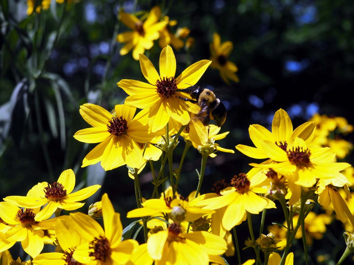 C. tripteris – Atlantic Coreopsis – This erect, stout perennial found from Michigan, Iowa, Louisiana to Pennsylvania grows 4-8′ feet tall and 2′ feet wide. From branched stems it carries 3 palmate, mid green leaves, 8″ long, with linear to oblong-lance-shaped leaflets. From summer to autumn it bears pale yellow flowers, 2″ across, with yellow centers, becoming brown purple.
