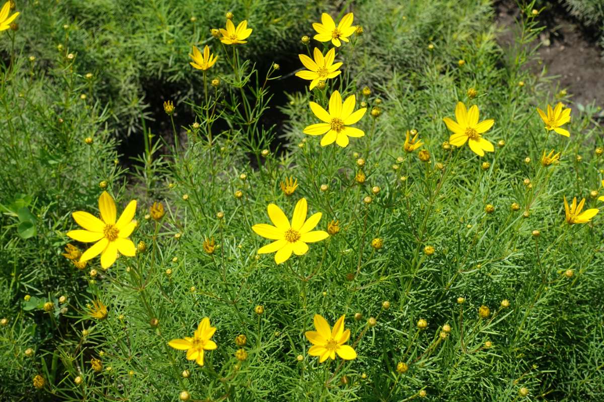 C. verticillata – Thread-leaved tickseed – This bushy, rhizomatous, slowly spreading, hairless perennial from Southeastern USA grows 24-32″ tall and 18″ wide. From numerous branched stems it carries 3 pinnate, to 2 ½” long, with linear, mid green leaflets. From late spring until fall it bears bright, yellow flowers, to 2″ across in loose corymbs.