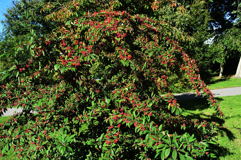C. ‘Cornubia’ – This vigorous, arching, semi evergreen large rounded shrub or small tree, may be a cross between C. frigidus and C. salicifolius grows 12-20′ feet tall and wide. It produces narrowly elliptic, dark green leaves, to 5″ long, come which turn bronze in winter. In summer it bears cymes of white flowers, followed abundant, almost spherical, bright red fruit, to 1/4″ long, which weigh down the branches.