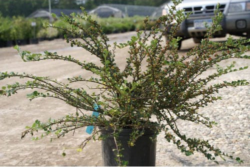 C. apiculatus – Cramberry Cotoneaster – This vigorous, more or less prostrate, deciduous shrub from Western China grows 3′ feet tall and 8′ feet wide. It produces rounded, pointed, wavy edged, glossy, mid green leaves, 3/4″ long, with slightly hairy undersides, and turn red to purple-red in autumn. In early summer it bears solitary, red tinged white flowers, followed by spherical red fruit, ½” long.