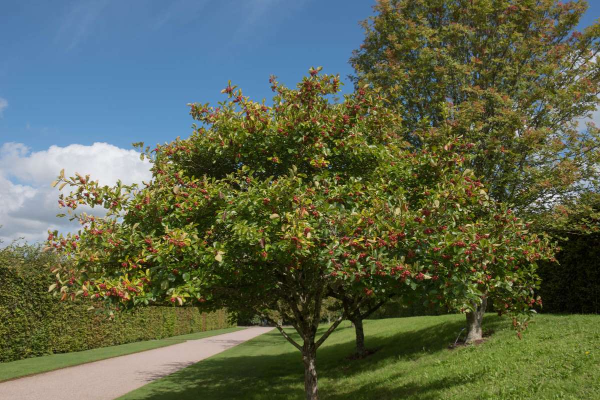 C. persimilis ‘Prunifolia’ – C. x prunifolia – C. crus-galli var. prunifolia – Cockspur Hawthorn – This rounded, deciduous tree from Eastern North America grows 20-25′ feet tall and 30′ feet wide. It produces 3″ long, thick, thorns and obovate to oval shaped, glossy, sharply toothed, deep green leaves, to 3″ long, which turn orange and red in autumn. In early summer it bears dense, rounded, corymbs of up to 15, white flowers, with pink anthers, to 1″ across, followed by glossy, spherical, bright red fruit, ½” in diameter.