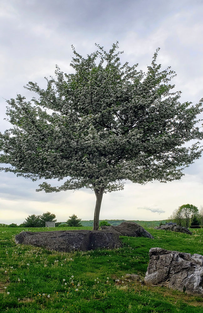 C. viridis – Green Hawthorn – This deciduous, tree from Southeastern USA grows 30-40′ feet tall and 12′ feet wide. It produces oval, dark green leaves with shiny undersides are sometimes slightly lobed with toothed edges. In spring it bears corymbs of white 3/4″ wide, flowers with pale yellow anthers, followed by small, round, red fruit, to 3/8″ in diameter