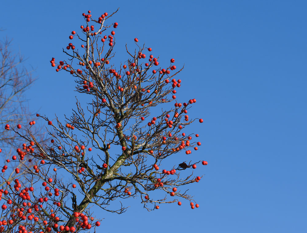 C. x lavallei ‘Carrierei’ – This strong growing, spreading, thorny, semi evergreen tree is a cross between C. crus-galli and C. pubescens and grows 15-23′ feet tall and 30′ feet wide. It produces elliptical to obovate, toothed, glossy, dark green leaves, to 4″ long, turning red in late autumn. In summer it bears erect, many flowered corymbs of white flowers, with red stamens, to 3/4″ across. Long lasting, ellipsoid or spherical, orange-red fruit, 3/4″ long, ripen in late autumn.