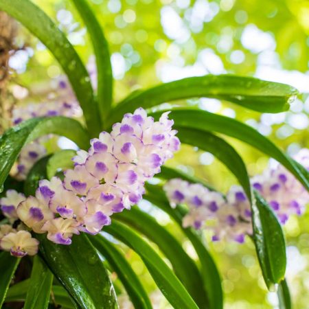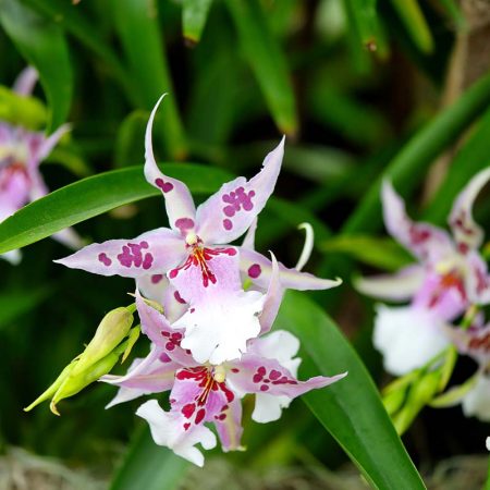 Cool growing orchids (see chart below). Grow in epiphytic orchid potting mix in a slatted basket. In summer, provide humid, shady condition, and water moderately with rainwater if possible, applying half strength fertilizer at every third watering. Water sparingly in winter.