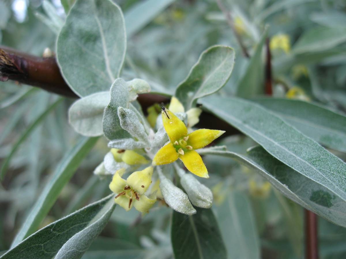 There are about 45 species of deciduous or evergreen shrubs or trees, some scrambling climbers, in this genus. They occur mainly in Asia, but few are from Southern Europe and North America, with one species from Australia, in wild in thickets, and dry places. They are grown for their often silvery leaves which are alternate, smooth edged and lance shaped to ovate or oblong, which are green or variegated or glistening with tiny silvery or rusty scales, and for their sometimes intensely fragrant flowers, held in clusters. The flowers are followed by edible, red, brown or yellowish berries, ½-1″ long. Grow in a shrub border or as specimen shrubs, evergreens are also suitable as a hedge.