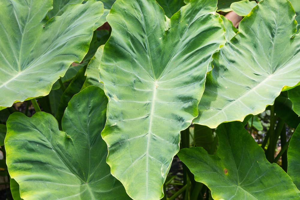 produces large leaves the shape of elephant ears that are deeply veined