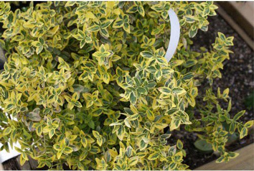 E. fortunei ‘Emerald’n Gold’ – E. radicans – Wintercreeper Euonymus – These prostrate to mound forming, or evening climbing by aerial roots,, evergreen shrubs from China grows 12″ inches tall and 36″ inches wide. They produce oval or elliptic, toothed, pointed, thinly, leathery, rich green leaves, usually to 2″ long with broad gold edges that tinged pink in winter. From early to mid summer it bears greenish white flowers followed by spherical white fruit, 1/4″ across, contains seeds with orange arils. They may suffer winter burn in cold climates, and best used as a groundcover.