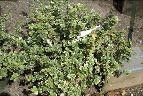 E. fortunei ‘Emerald Gaiety’ – E. radicans – Wintercreeper Euonymus – This prostrate to mound forming, or evening climbing by aerial roots, evergreen shrubs from China grows 3” feet tall and 5′ feet wide. They produce oval or elliptic, toothed, pointed, thinly, leathery, rich green leaves, usually to 2″ long, with broad gold edges that tinged pink in winter. From early to mid summer it bears greenish white flowers followed by spherical white fruit, 1/4″ across, contains seeds with orange arils. They may suffer winter burn in cold climates, and best used as a groundcover.