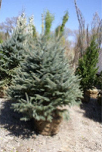 semi dwarf dense pyramidal form of blue spruce with bright blue foliage