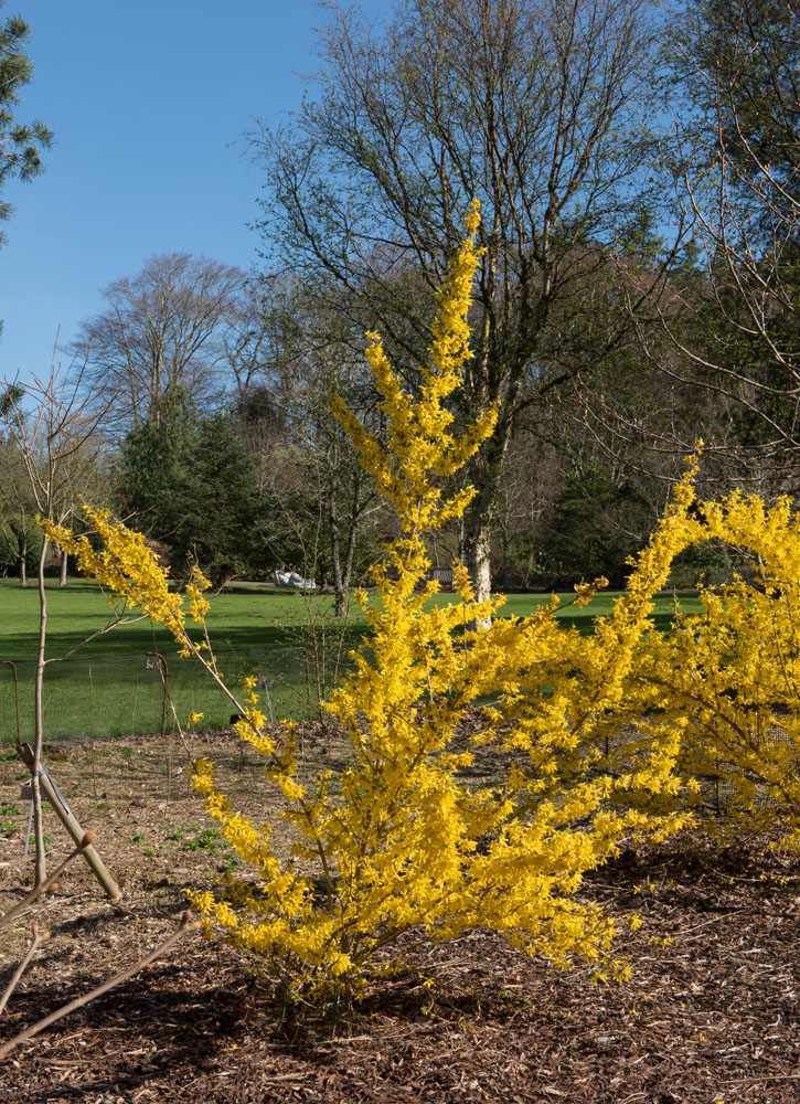 F. x intermedia ‘Spectabilis’ – Border Forsythia – This vigorous, bushy, deciduous shrub, grows 8-10′ feet tall and 6′ feet wide. From arching or spreading branches it carries ovate to lance shaped, dark green simple leaves, occasionally 3 lobed, to 4″ long with sharp teeth, on red stalks. In early and mid spring it bears deep yellow flowers, to 1 1/4″ across, are held in groups of 2 or 6.