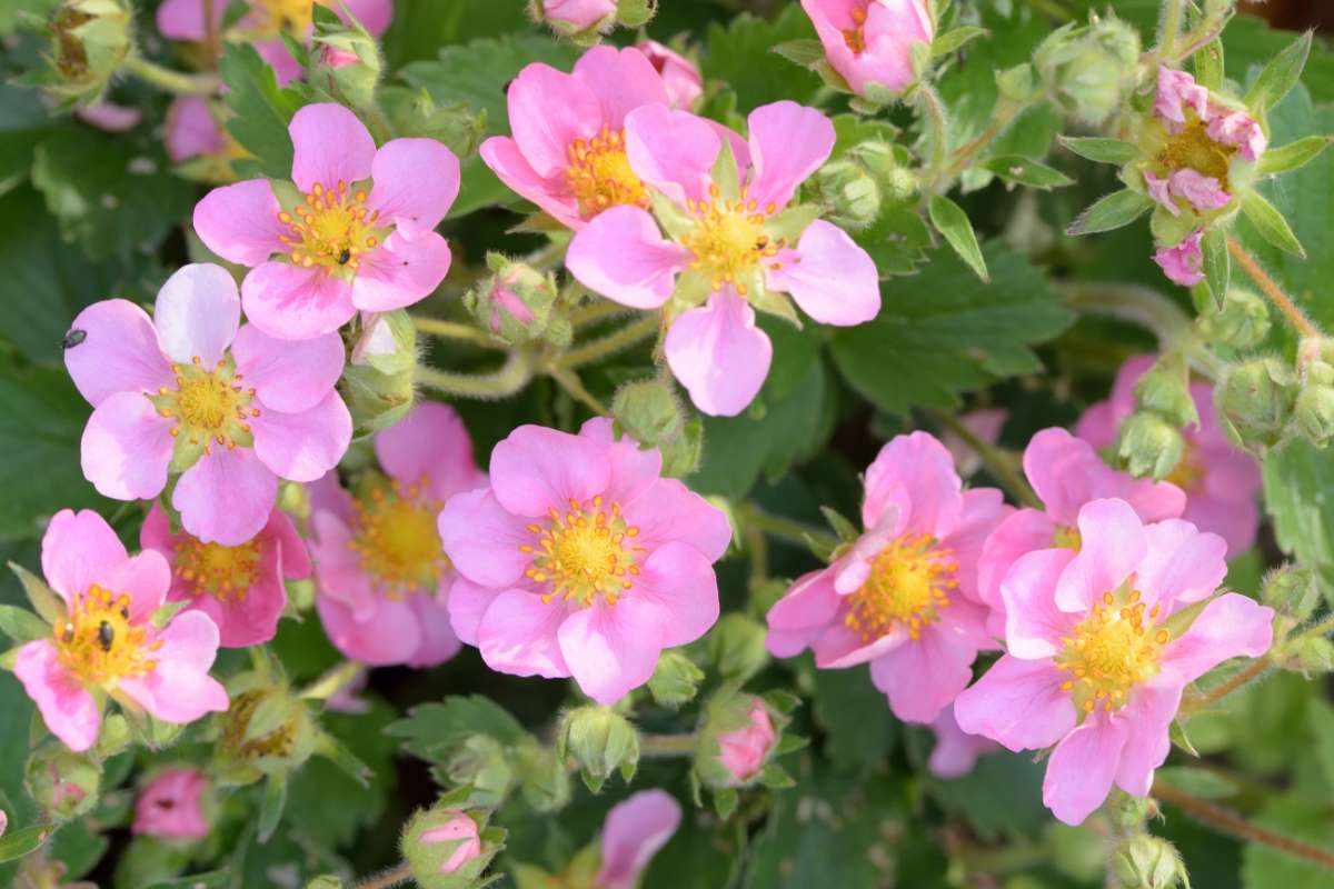 F. ‘Pink Panda’ – This stoloniferous ground covering perennial grows 4-6″ tall with an indefinite spread. It produces 3 palmate leaves, with broad, ovate, toothed leaflets, to 1 ½” long, and reddish green leaf stalks. From late spring to mid autumn it bears cymes of bright pink flowers, to 1″ across, with 5-7 rounded petals. It rarely bears fruit.