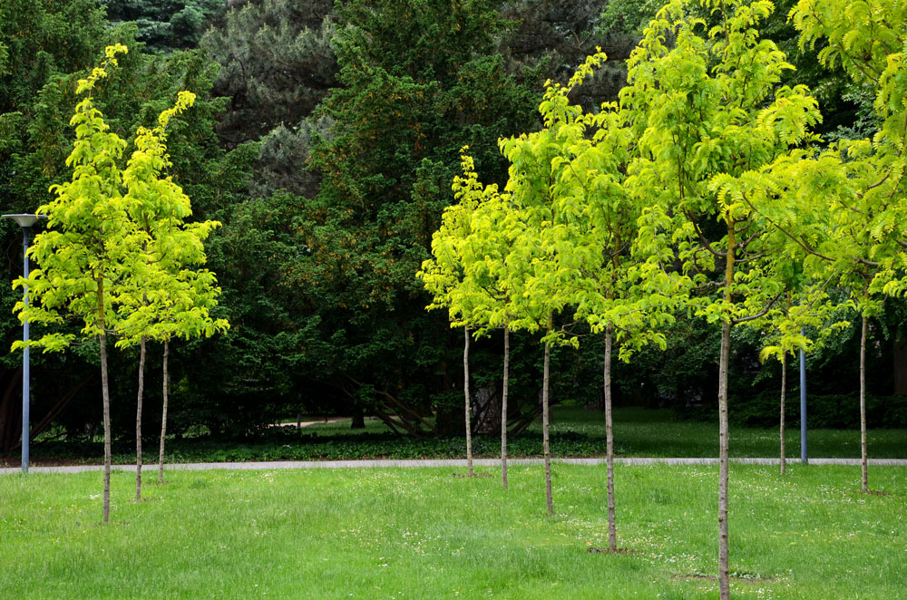 Gleditsia triancanthos ‘Sunburst’ – is fast growing, reaching 40′ feet tall and 30′ feet wide and is broadly conical with spreading, thornless branches, and bright yellow young foliage, fresh lime green at maturity, yellow in autumn. Does not fruit and is a popular cultivar.