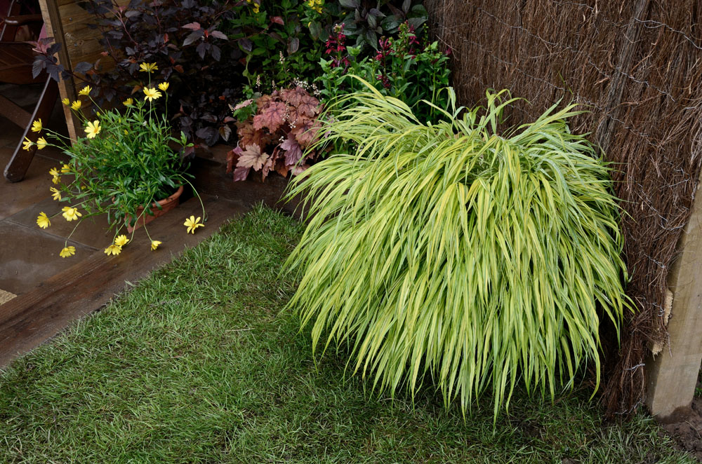H. macra ‘Aueola’ – Golden Variegated Hakonechloa – This perennial grass from Japan grows 12-24″ tall and 16″ wide. It slowly spreads to form mounds of arching, linear leaves, to 10″ long. Leaves are bright yellow with narrow green stripes, becoming red flushed in autumn, the color often persisting into winter. From late summer to mid autumn it bears needle like pale green spikelets in open panicles, to 7″ long.