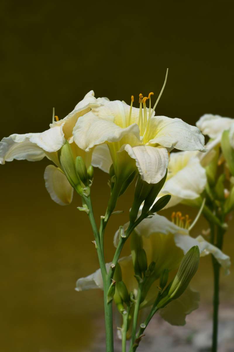 H. ‘Gentle Sheperd’ – This semi evergreen diploid grows 26″ tall. It produces wispy leaves. In mid season it bears circular, ivory white flowers, 5 ½” across, with oval tepals and green throats, held atop slender stems.