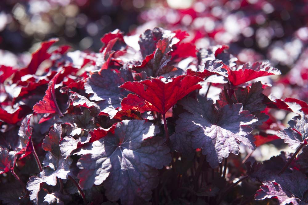 H. americana – This mound forming perennial from Central and Eastern North America grows 18″ tall and 12″ wide. It produces rosettes of broadly ovate to heart shaped, 5 to 9 lobed, glossy, leathery leaves, 2-5 ½” long. Young foliage in marbled and veined brown, maturing to deep green with copper-green shading. In early summer it bears panicles of brownish green flowers.