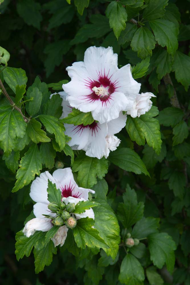H. syriacus – Rose of Sharon – Blue Hibiscus – Shrub Althea – Syrian Hibiscus– This erect, deciduous shrub, evergreen in warmer climates is found from China to India and grows 12′ feet tall and 6-10′ feet wide.It is the hardiest of all Hibiscus.From smooth gray branches it carries ovate to diamond shaped, shallowly to palmately 3 lobed, coarsely toothed, dark green leaves, to 4″ long.From late summer to mid autumn it bears large, single or double, trumpet shaped, dark pink flowers, to 2 ½” across, with dark red centers and yellow anthered white stamen, are held singly or in pairs