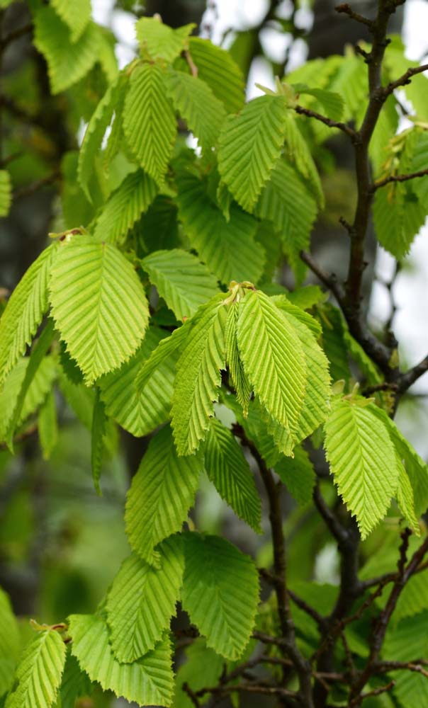 C. betulus – Common Hornbeam – European Hornbeam – This pyramidal, later irregularly rounded treed from Europe, Turkey, Asia and the Ukraine grows 80′ feet tall and 70′ feet wide although 30′ feet tall is more common.It has flutted, smooth pale gray bark.It produces ovate, prominently veined and unequally toothed, mid green leaves 3-5″ long, turning yellow to orange in autumn.In spring it bears yellow male catkins, to 1 1/4″ long and greenish female catkins, to 5″ long.Female catkins are followed by racemes, 1 1/4-2 ½” long, of green fruit with prominent, 3 lobed bracts, maturing to yellow-brown.