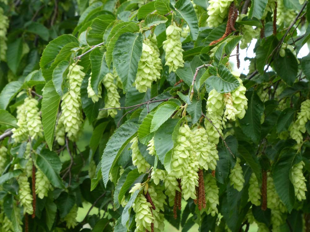 C. betulus – Common Hornbeam – European Hornbeam – This pyramidal, later irregularly rounded treed from Europe, Turkey, Asia and the Ukraine grows 80′ feet tall and 70′ feet wide although 30′ feet tall is more common.It has flutted, smooth pale gray bark.It produces ovate, prominently veined and unequally toothed, mid green leaves 3-5″ long, turning yellow to orange in autumn.In spring it bears yellow male catkins, to 1 1/4″ long and greenish female catkins, to 5″ long.Female catkins are followed by racemes, 1 1/4-2 ½” long, of green fruit with prominent, 3 lobed bracts, maturing to yellow-brown.