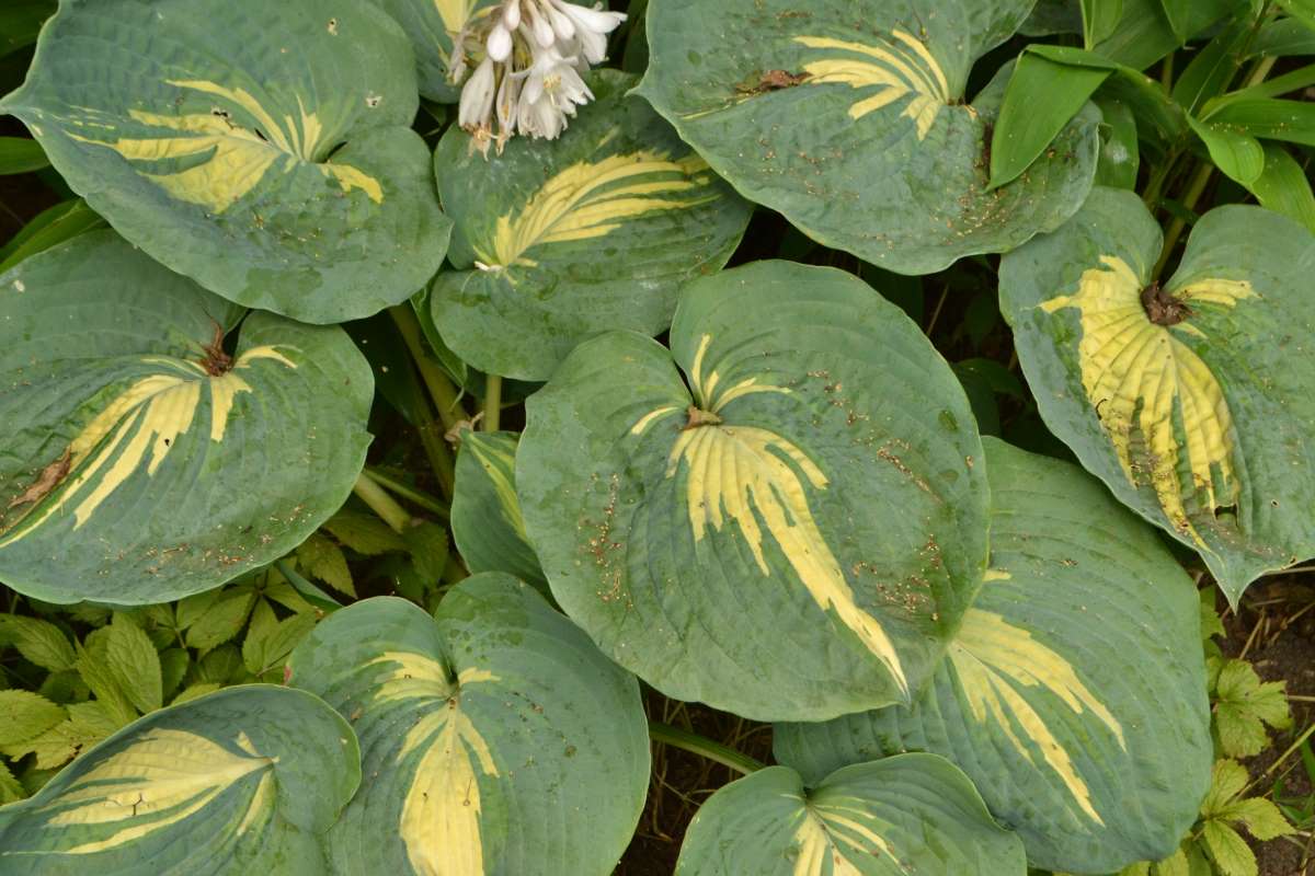 H. ‘Dream Weaver’ – This slow growing, clump forming perennial grows 18″ tall and 30″ wide. It produces nearly round, corrugated, blue green leaves, 9″ long, with narrow white leaf centers. Early in the season it bears bell shaped, near white flowers. It is a sport of H. ‘Great Expectations’, but its wider blue-green edged leaves make it more vigorous.