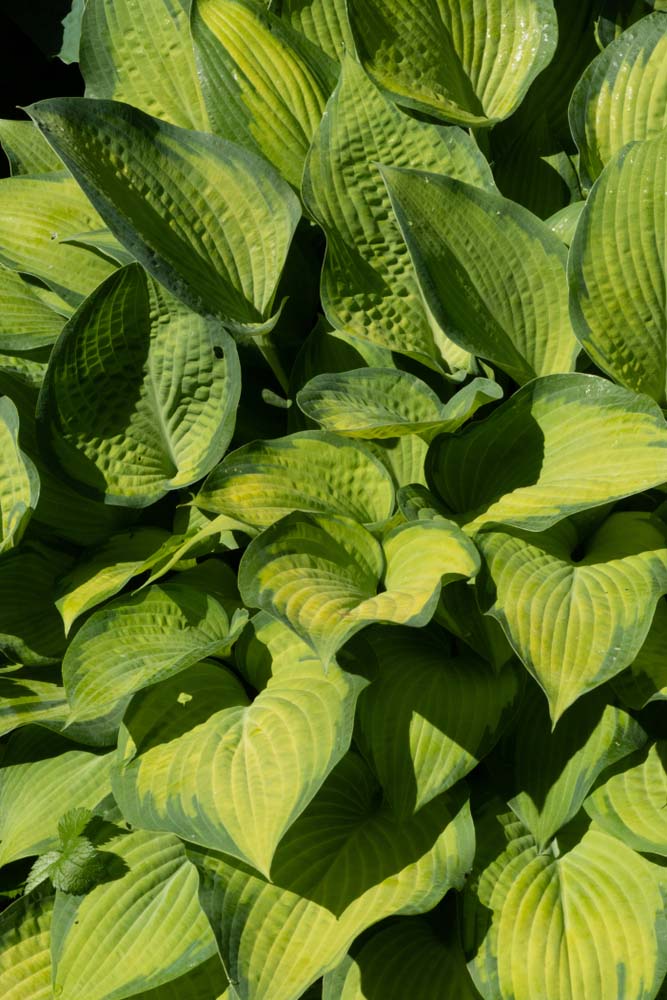 H. ‘Paul’s Glory’ – This clump forming perennial grows 20″ tall and 36″ wide. It produces heart shaped, puckered yellow leaves, 6″ long, irregularly edged glaucous, gray-blue and yellow-green. In mid summer, leafy arching, glaucous stems, 24″ long, carry bell shaped, lavender gray flowers