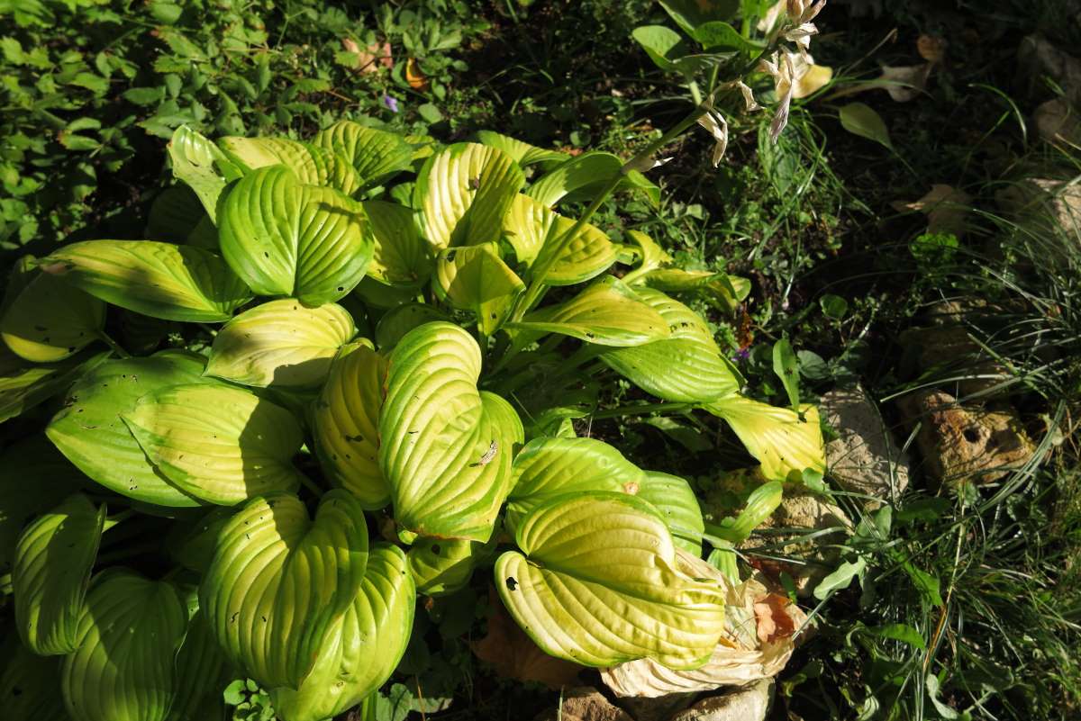 H. ‘September Sun’ – This vigorous, clump forming perennial grows 26″ tall and 36″ wide. It produces ovate to heart shaped, flat, lime green to yellow leaves, 6″ long, irregularly edged dark green, the variegation developing as the leaves mature. In summer, it bears bell shaped, very pale lavender blue flowers on 30″ stems. Thrives in sun or partial shade.